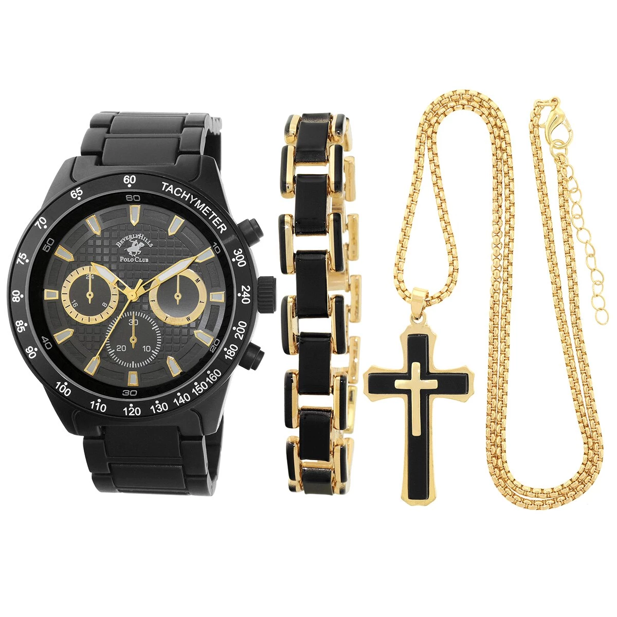 The Mens Beverly Hills Polo Club analog metal matte black watch set features a grey sunray dial, black 50mm case, 8-inch gold & black bracelet, 12-inch gold & black cross necklace, and water resistance.