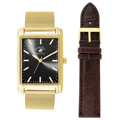 This Mens Beverly Hills Polo Club watch set features a gold case and black dial with gold mesh strap and brown leather crocodile interchangeable band.Style 54241.Limited Manufacturer’s Warranty.