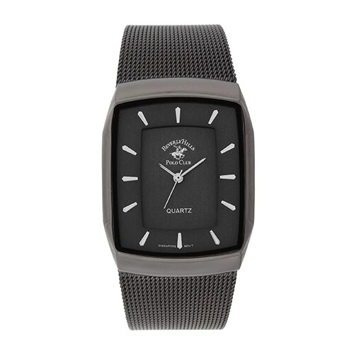 This mens Beverly Hills Polo Club watch has a gunmetal rectangular case and dial. The gunmetal mesh band finishes off the look. Quartz movement.Style 53302.Limited Manufacturer’s Warranty.
