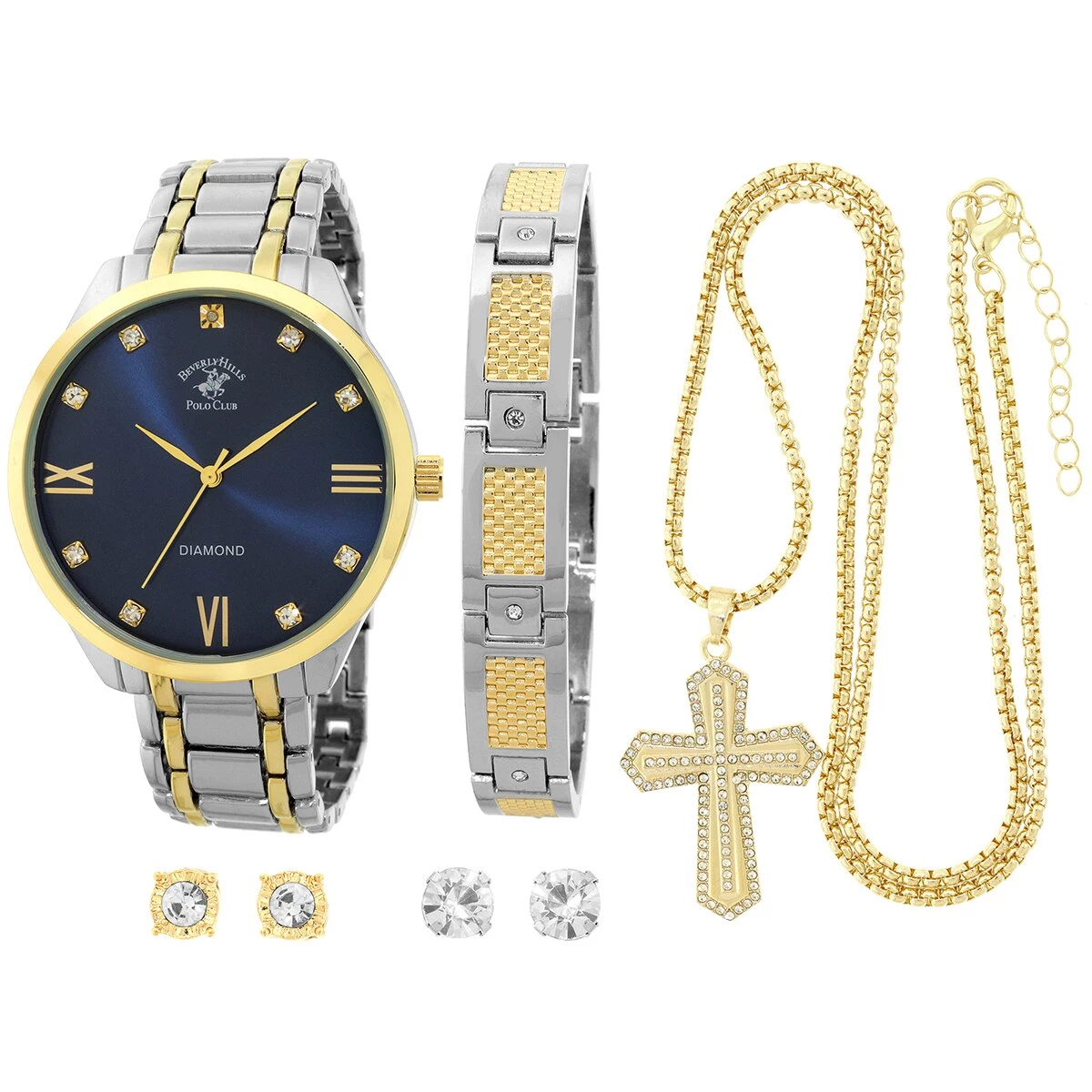 Mens Beverly Hills Polo Club analog metal two-tone watch set with blue sunray dial, gold 47mm case, 8-inch silver & gold bracelet, 12-inch silver rhinestone cross necklace, 2-piece silver & gold earrings, and water resistance.
