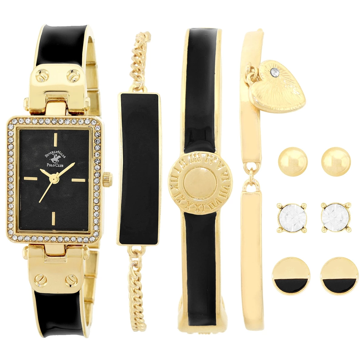 The Womens Beverly Hills Polo Club analog gold and black watch set showcases gold and black enamel metal, a black enamel dial, a gold case, three 8-inch black and gold enamel bracelets, and 3-piece earrings set.