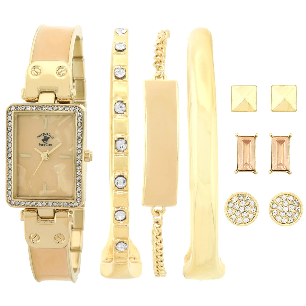 The Womens Beverly Hills Polo Club analog gold and tan watch set showcases gold and tan enamel metal, tan enamel dial, gold case, three 8-inch tan, and gold enamel bracelets, and 3-piece earrings set.