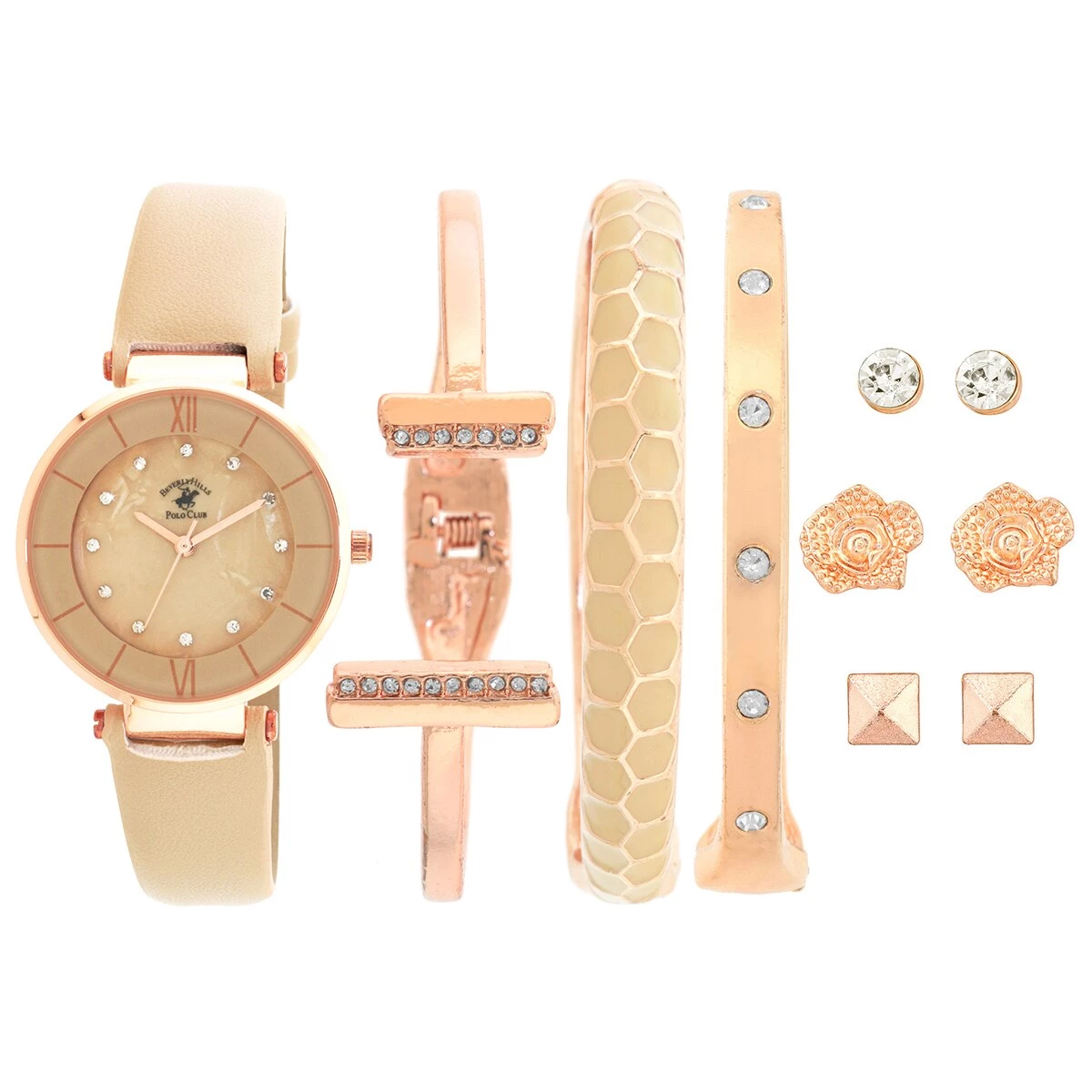 The Womens Beverly Hills Polo Club analog nude watch set features a nude strap watch, pink enamel dial, rose gold case, three 8-inch rose gold bracelets, and 3-piece earrings set.