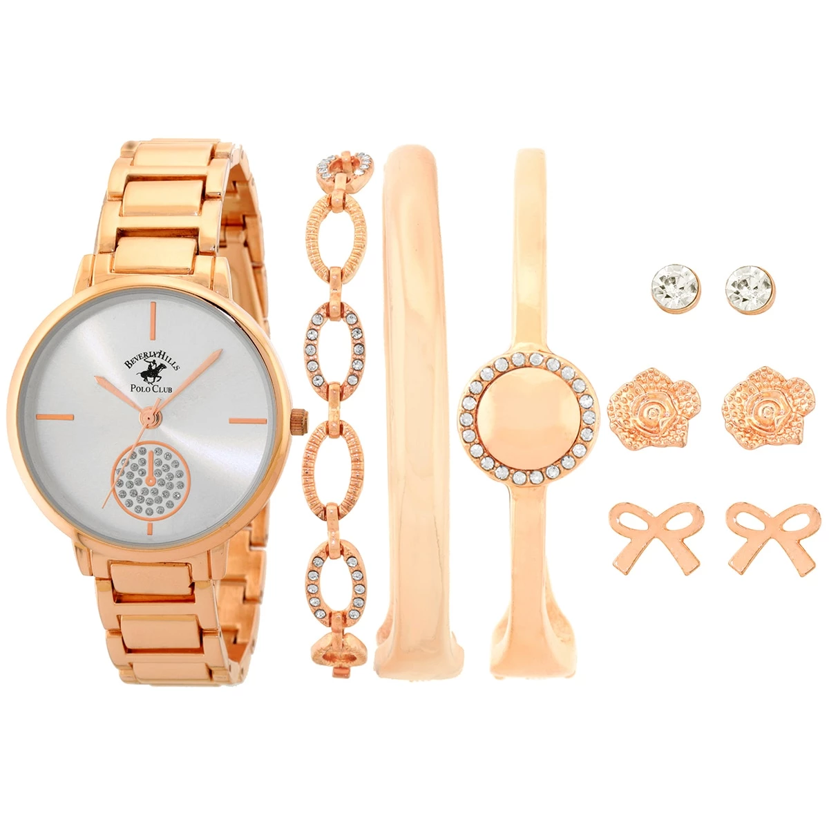 The Womens Beverly Hills Polo Club analog rose gold watch set features rose gold metal, silver sunray dial, rose gold case, three 8-inch rose gold bracelets, 3-piece earrings set.