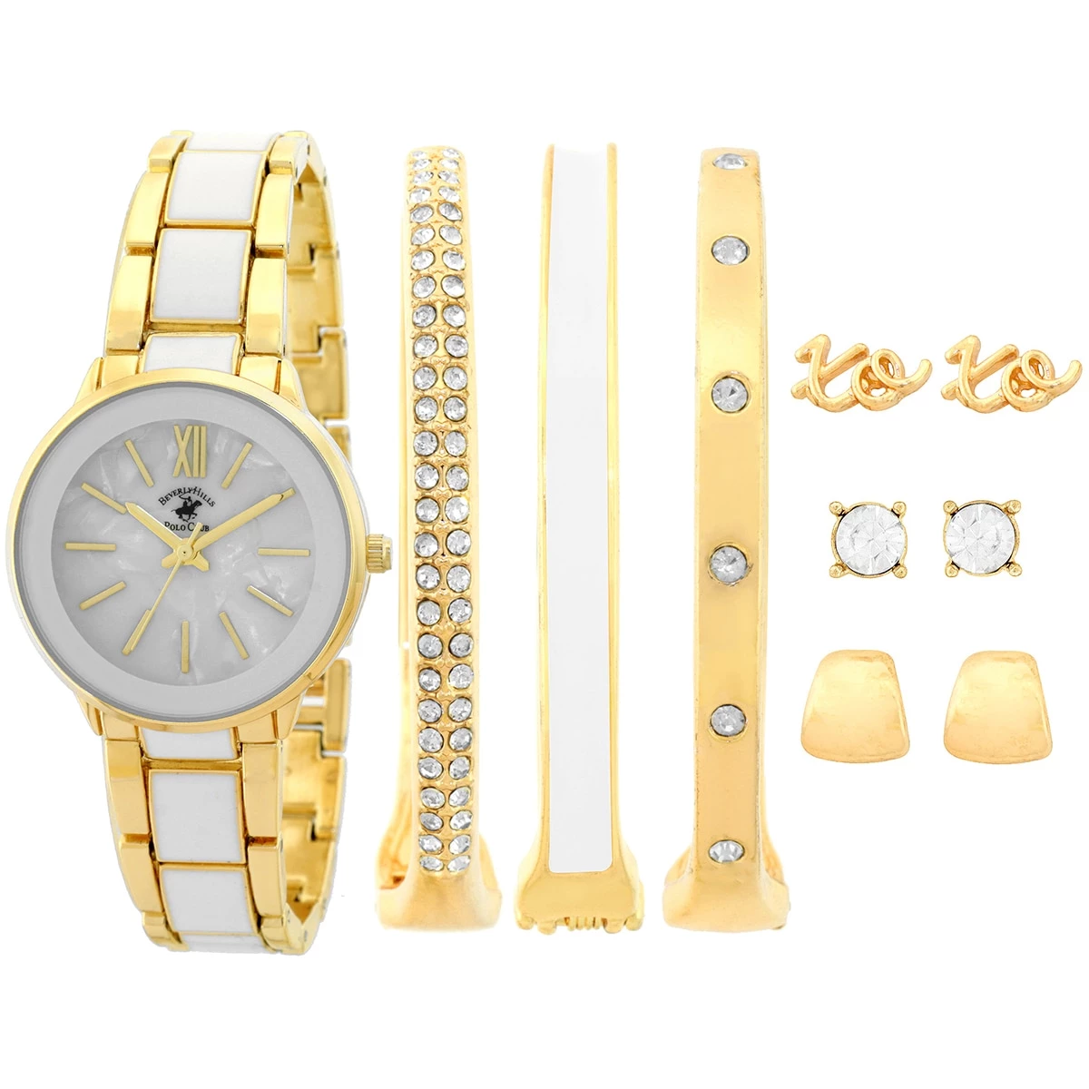 The Womens Beverly Hills Polo Club analog gold and white watch set features gold metal, gold and white enamel dial, gold case, three 8-inch gold, and white bracelets, and 3-piece earrings set.