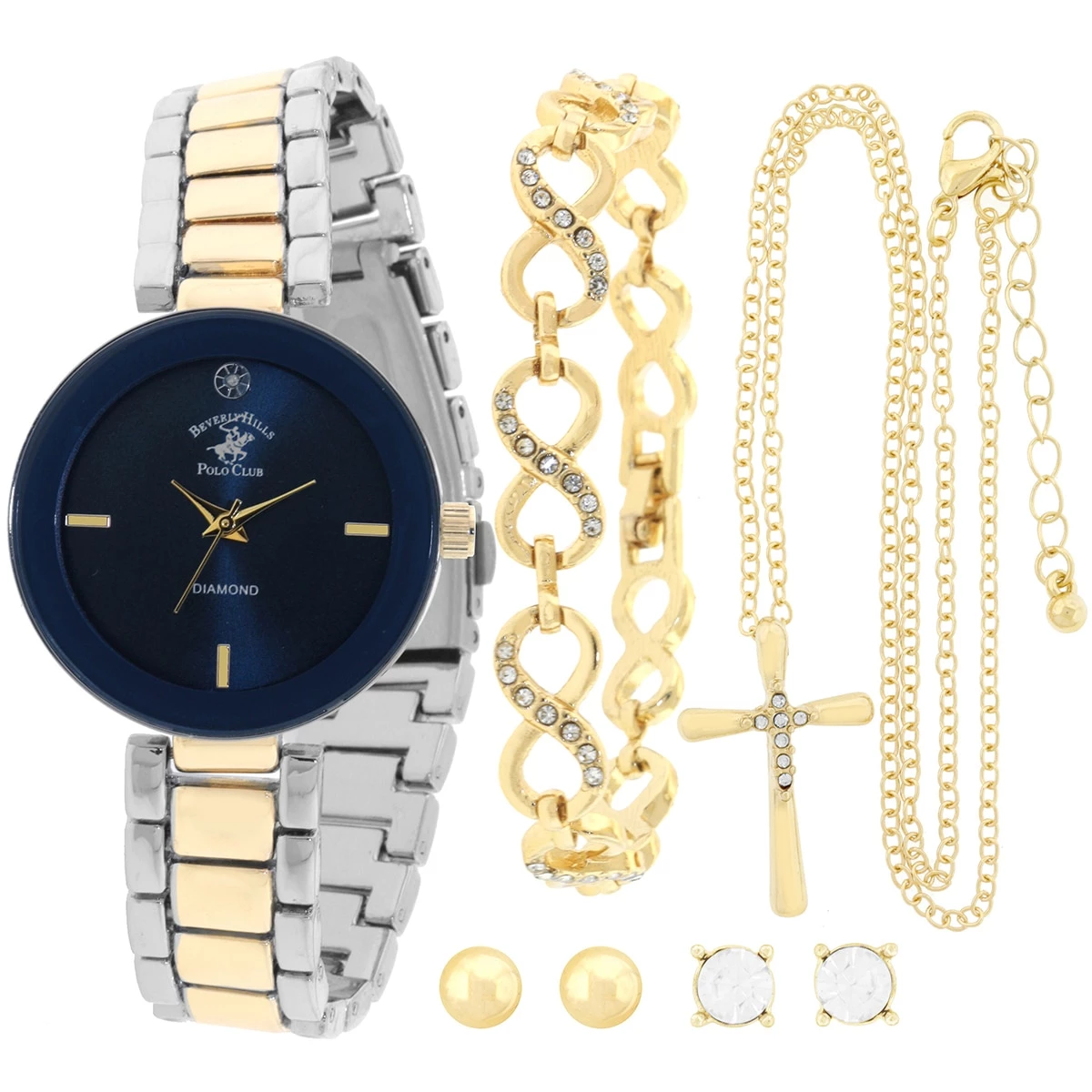 The Womens Beverly Hills Polo Club analog two-tone watch set showcases two-tone metal, a blue sunray dial, a silver case, one 8-inch gold bracelet, one 12-inch gold necklace, and 2-piece earrings set.