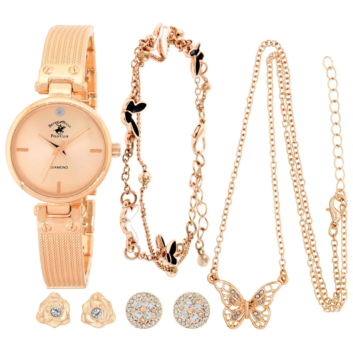 The Womens Beverly Hills Polo Club analog rose gold watch set features rose gold metal, rose gold dial, a rose gold case, one 8-inch rose gold bracelet, one 12-inch rose gold necklace, and 2-piece earrings set.