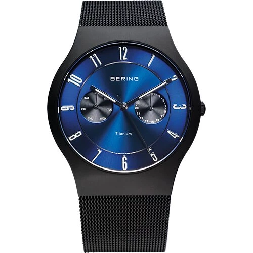 This Mens BERING quartz movement chronograph watch features a blue sunray dial, titanium case and black stainless steel mesh strap with fold over clasp. The dial window is sapphire crystal. The case is 39mm wide. Water resistant to five atmospheres (50 meters).Style 11939-078.Limited Manufacturer’s Warranty.