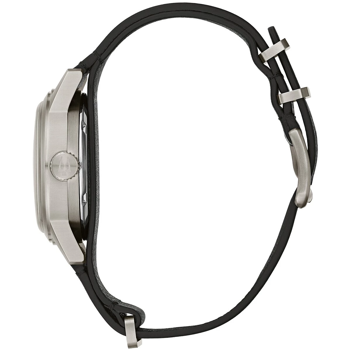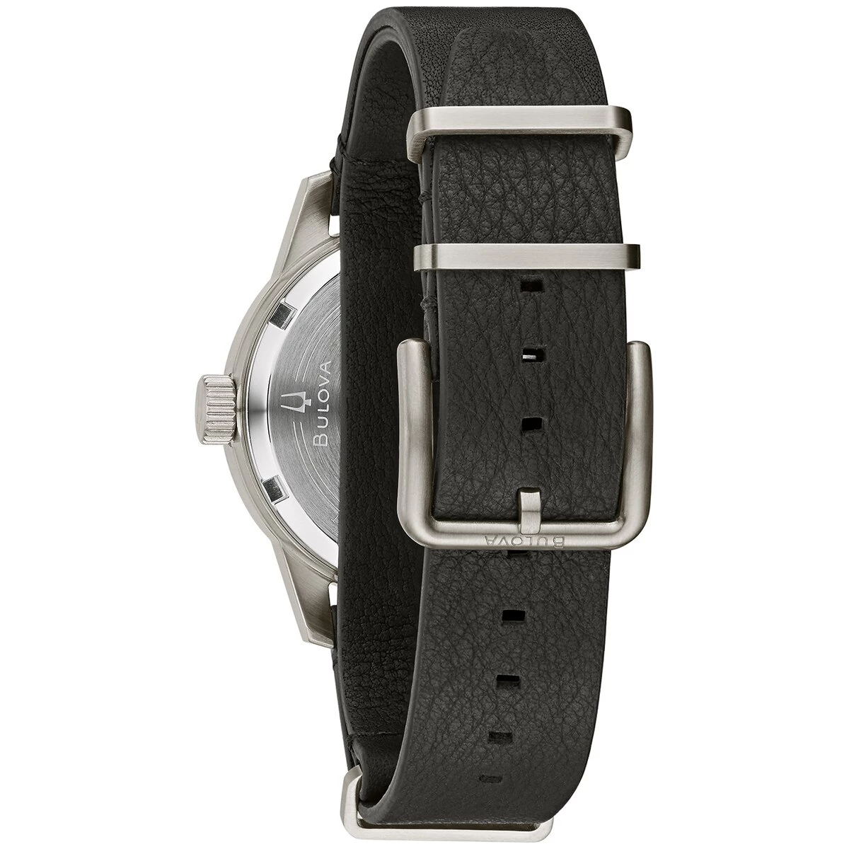 Inspired by Bulova’s military heritage and vintage watches of the time, the Mens Bulova Automatic Black Leather NATO Strap Watch infuses historical elements for a contemporary lifestyle. The updated style features a three-hand, 21-jewel automatic movement with a 42-hour power reserve. The stainless steel case with an ivory dial and luminescent hands and markers also features a center track on the dial displaying 24H time.