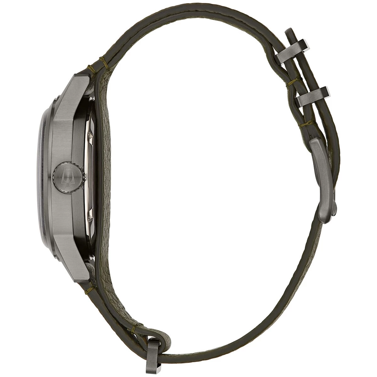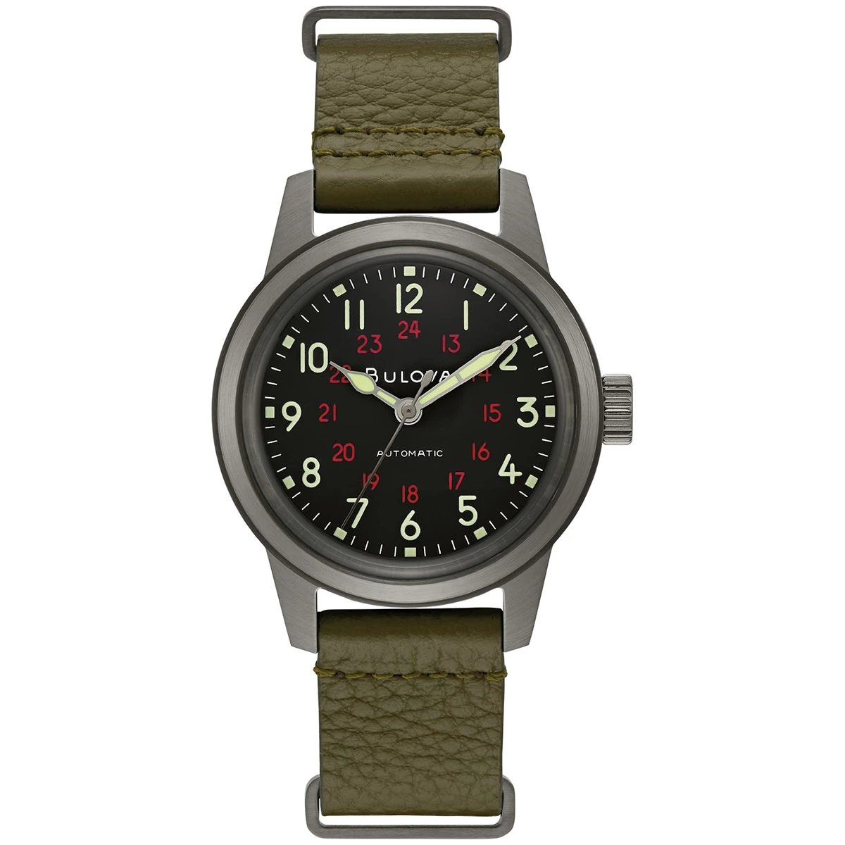 Inspired by Bulova’s military heritage and vintage watches of the time, Mens Bulova Automatic Green Leather NATO Strap Watch infuses historical elements for a contemporary lifestyle. The updated style features a three-hand, 21-jewel automatic movement with a 42-hour power reserve. The gray stainless steel case with a black dial and luminescent hands and markers also features a red center track on the dial displaying 24H time.