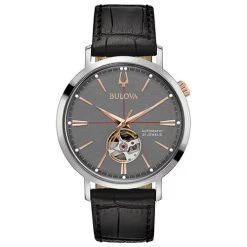The Mens Bulova Classic Automatic Collection watch showcases a sleek stainless steel case with a rose gold-tone crown at two o’clock position and an open aperture gray dial with rose gold-tone hands and markers. It features an exhibition case back, automatic heart beat self winding movement with a 40 hour power reserve, boxed mineral glass, croco embossed black leather strap with a simple three piece buckle closure, and is water resistant to 30 meters. Watch case dimension: 41mm.Style 98A187.Limited Manufacturer’s Warranty.