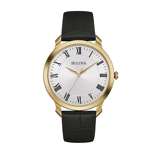 This Mens Bulova Classic gold-tone watch showcases a striking stainless steel case in a gold-tone finish with a white dial. It features flat mineral glass, a croco embossed Black Leather strap with a three-piece buckle closure, and is water resistant up to 30 meters. Case Size: 41mm.Style 97A123.Limited Manufacturer’s Warranty.