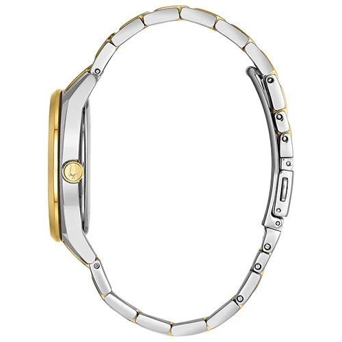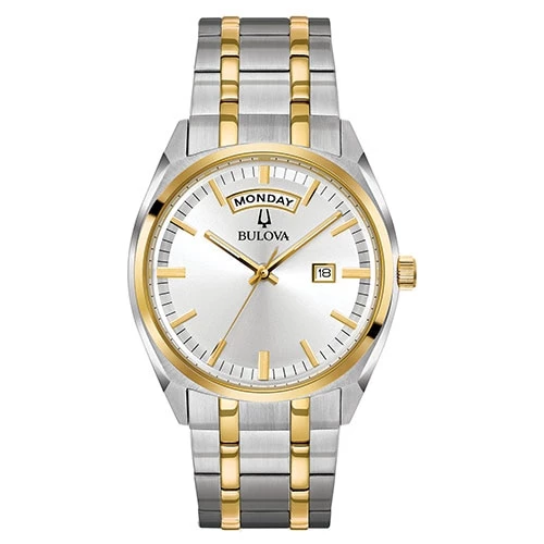 This Mens Bulova Classic watch showcases a stunning two-tone stainless steel case, a new three-hand day/date feature, and a white dial with gold-tone hands and markers. Other features include: domed mineral glass, and a gold-tone and stainless steel bracelet that is finished with a short fold-over double-push closure. To clean wipe with a soft dry cloth. Case Dimensions: 39mm x 10mm.Style 98C127.Limited Manufacturer’s Warranty.
