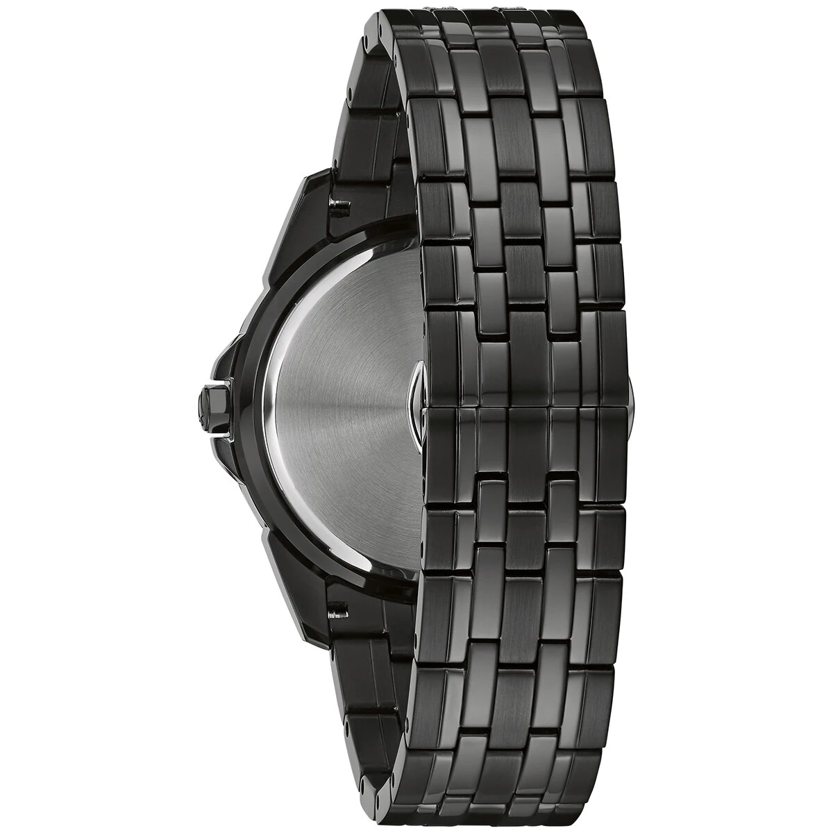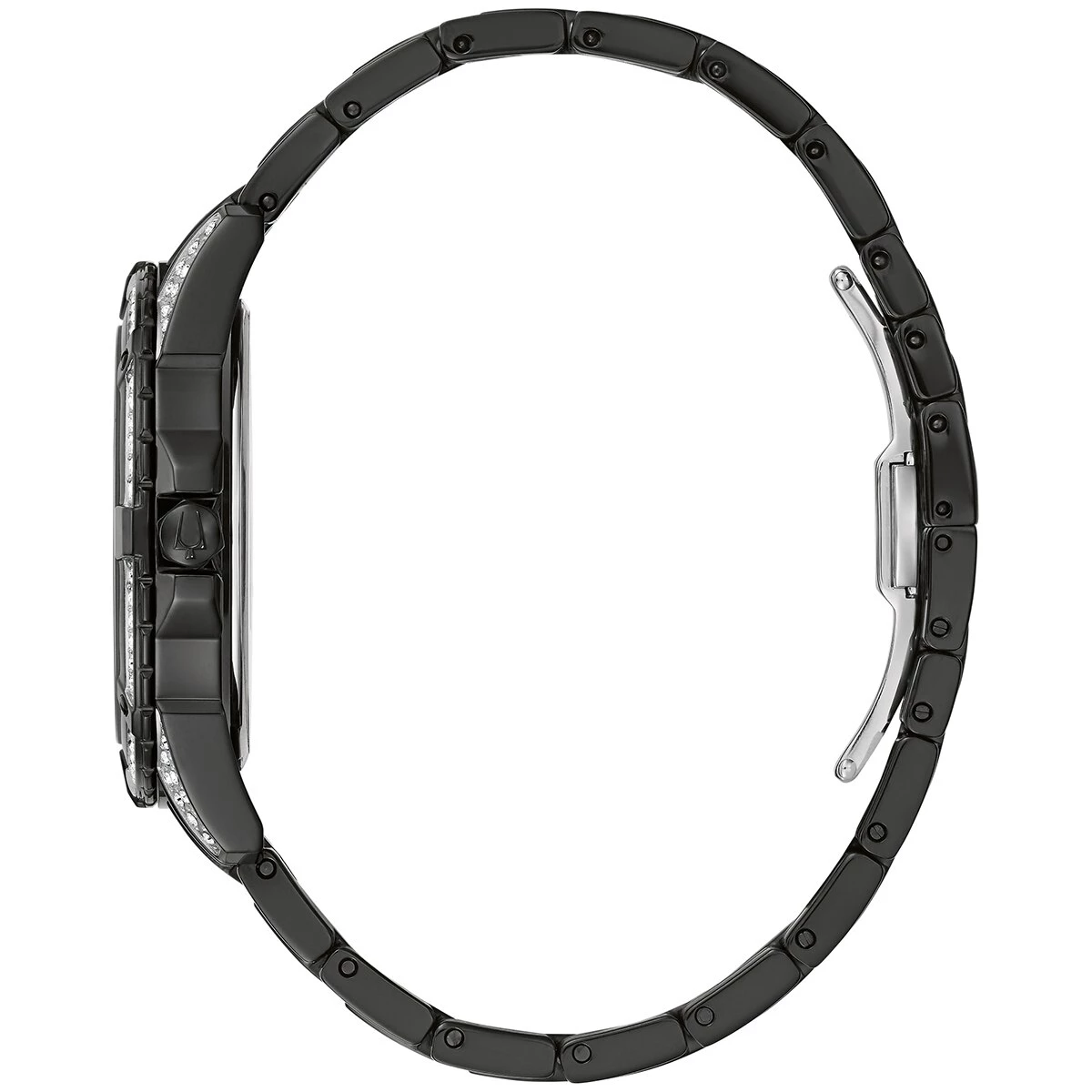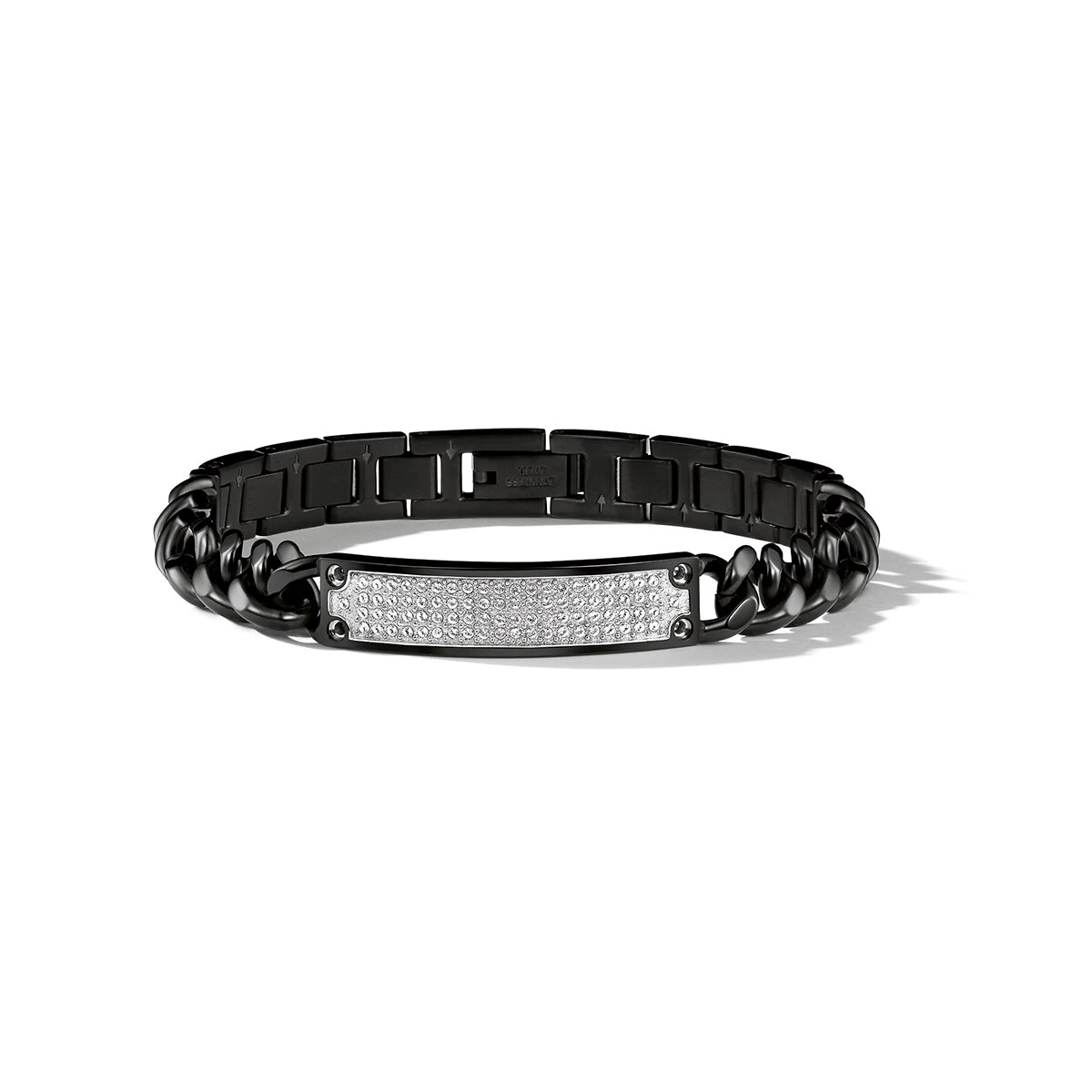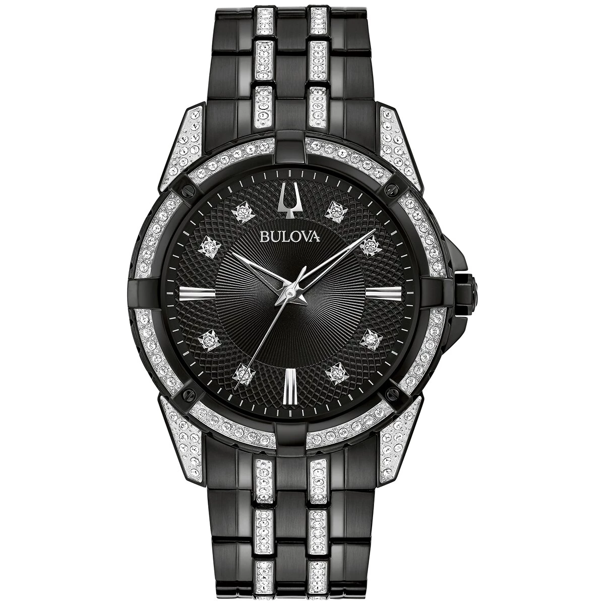 This Mens Bulova crystal accent watch and bracelet gift set coordinate for easy styling. The watch has a black stainless steel case and bracelet featuring 164 brilliant crystals around the case, bracelet, and on the black dial. Also includes flat mineral crystal, three-hand quartz movement, deployant buckle with pushers, and water resistance to 50 meters. The black ID bracelet also features 82 crystals. Presented in an elegant gift box.Limited Manufacturer’s Warranty.