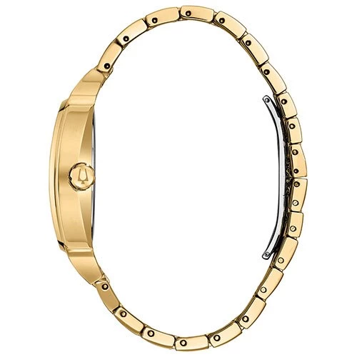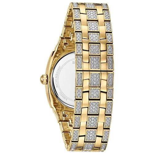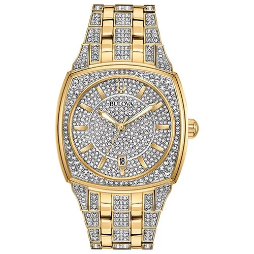This Mens Bulova watch is embellished with 582 crystals on the cushion shaped stainless steel and gold-tone case and bracelet. Other features include a round pave set three hand silver white dial with date feature, curved mineral crystal, a deployant closure and is water resistance to 30 meters. This piece is from the Quartz movement. Case Dimensions: 40mm.Style 98B323.Limited Manufacturer’s Warranty.