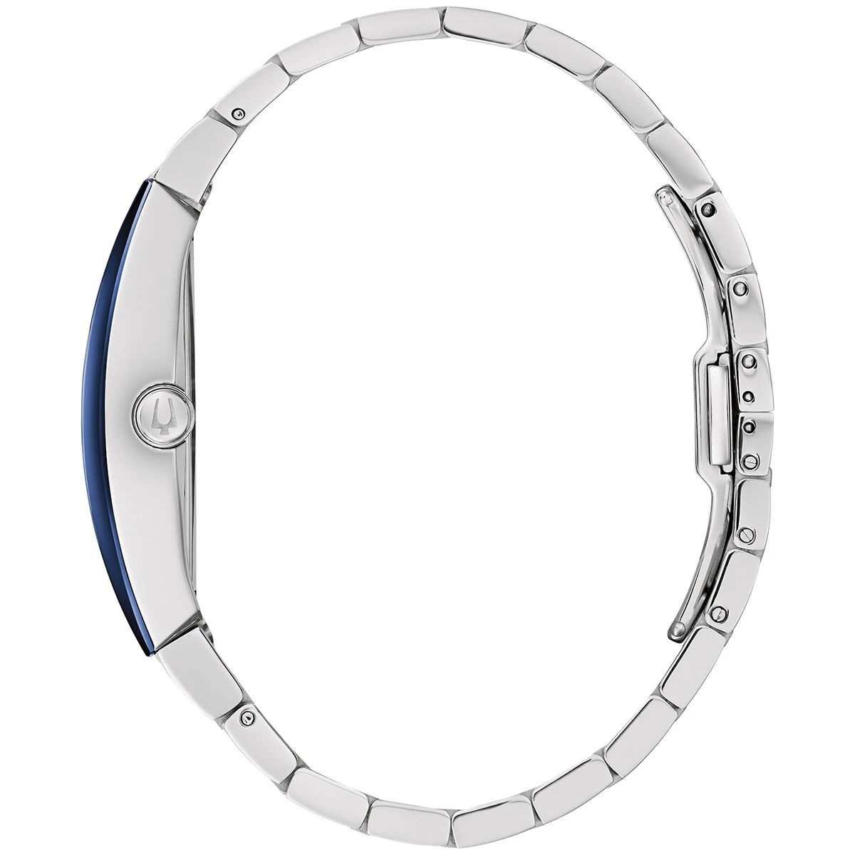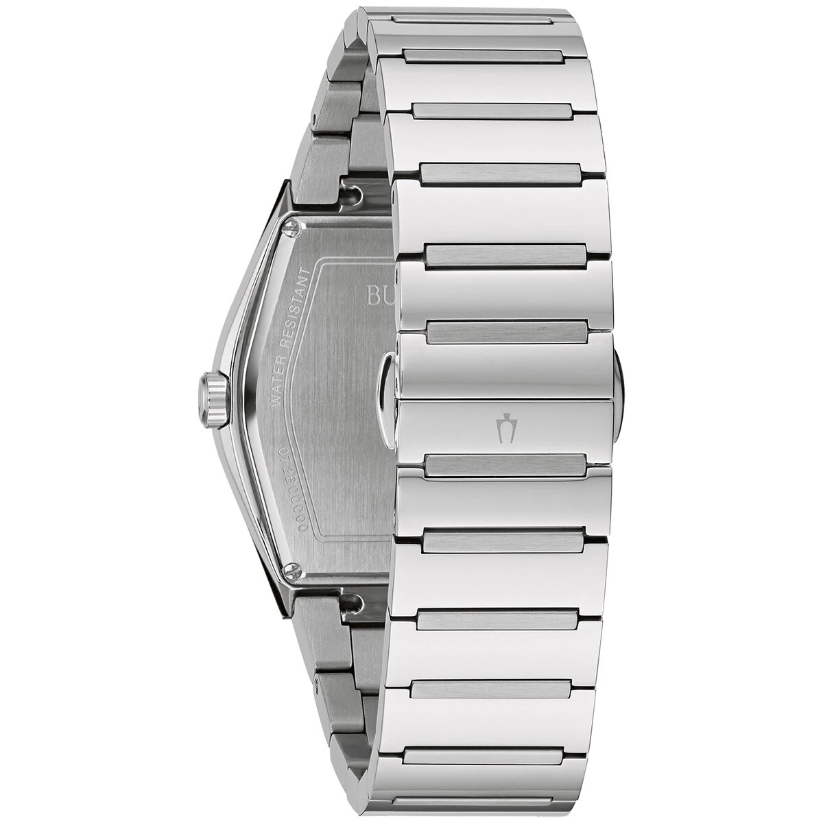 This Mens Bulova Futuro stainless tonneau blue dial bracelet watch has a three-hand quartz movement, a deployment buckle with pushers, and water resistance to 30 meters. The distinctive asymmetrical tonneau-shaped stainless steel case watch with a blue signature Futuro edge to edge curved metalized crystal features a blue dial and a stainless steel bracelet.Limited Manufacturer’s Warranty.
