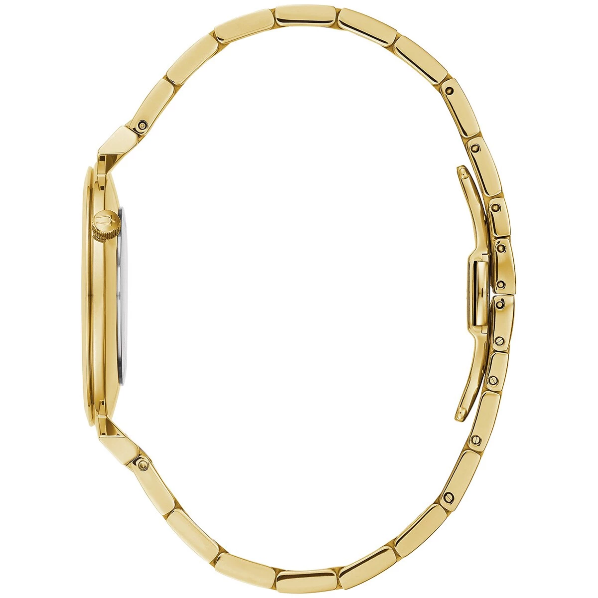 Inspired by Bulova heritage timepieces, the Mens Bulova Goldtone Bracelet Watch features slim Roman numeral markers on a white dial, the crown at the 2 o’clock position, and unique angled lugs.