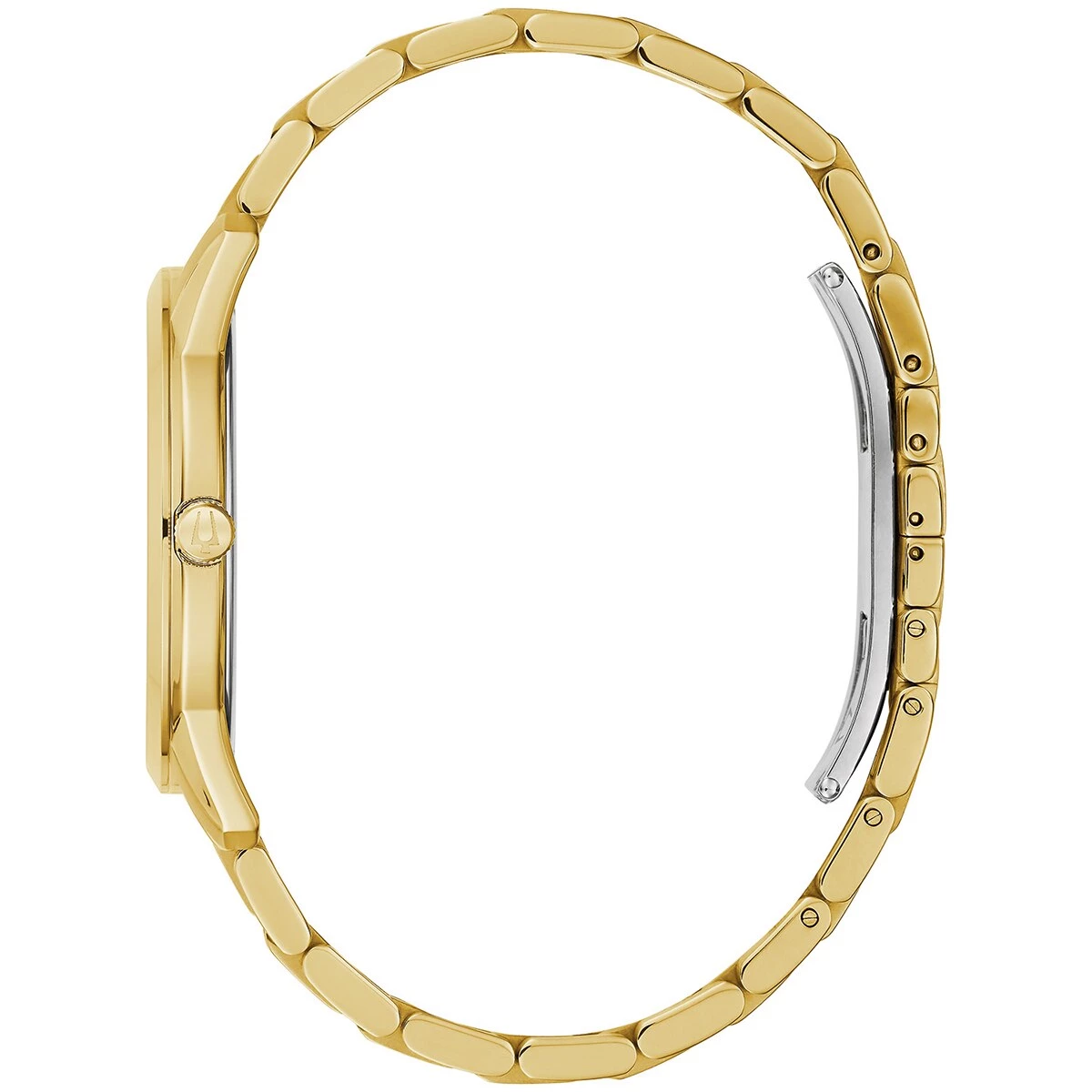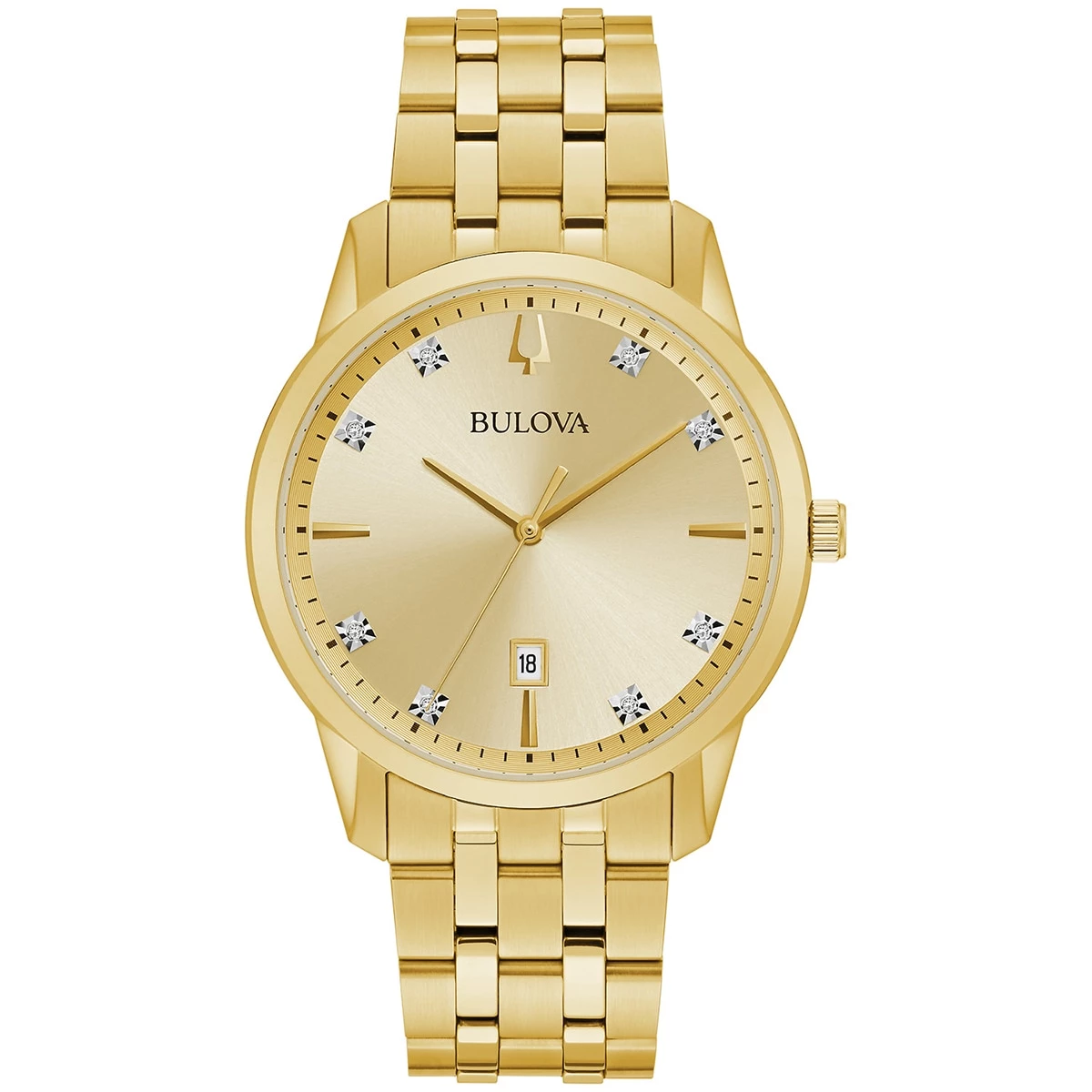 This Mens Bulova Goldtone Diamond Dial Bracelet Watch has a champagne dial featuring eight diamonds set on the dial, gold-tone hands and markers, and a calendar window at the six o’clock position.