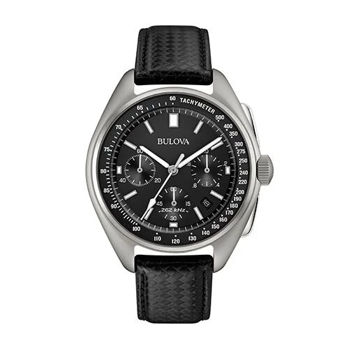 Bulova Lunar Pilot chronograph watch features super-luminous hands and markers, anti-reflective sapphire glass, tachymeter and calendar all housed in a solid 316L surgical-grade stainless steel case in silver-tone with black dial. Two interchangeable straps are included – one a textured black leather, and one black nylon with a nubuck leather patch. Case dimensions: 45mm.Style 96B251.Limited Manufacturer’s Warranty.