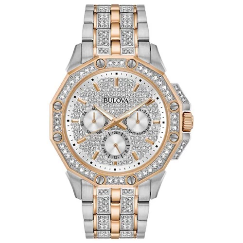 This Mens Bulova Octava two-tone crystal bracelet watch is an absolutely stunning piece that is boldly embellished with 300 crystals. It features a two-tone silver and rose-gold-tone stainless steel case and bracelet with a pave set silver white dial. Water resistance to 30 meters. Case Size: 41.5mm.Limited Manufacturer’s Warranty.