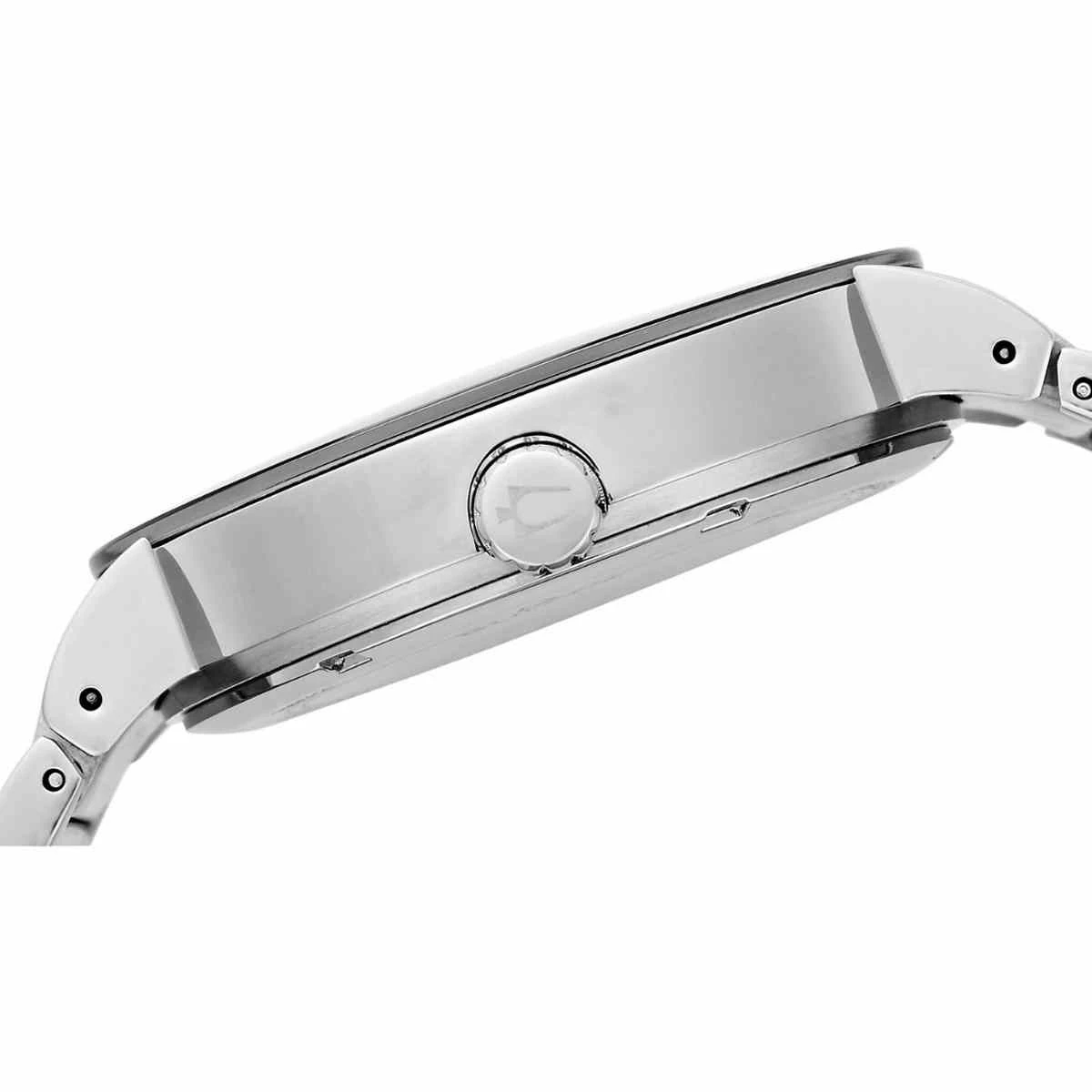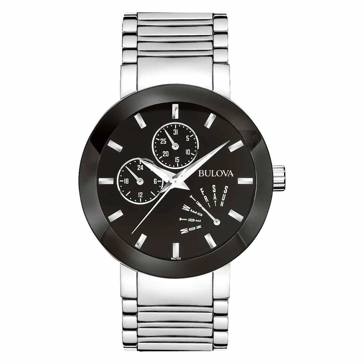 This Mens Bulova stainless steel black dial watch is a masculine multifunctional timepiece. Its design is in stainless steel with domed metalized crystal, a black enamel dial, a retrograde day indicator, 24-hour and date sub dials, luminous hands, and a screw-back case. It is finished with a simple deployant closure and is water resistant to 30 meters.