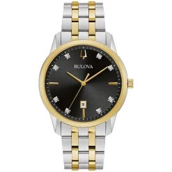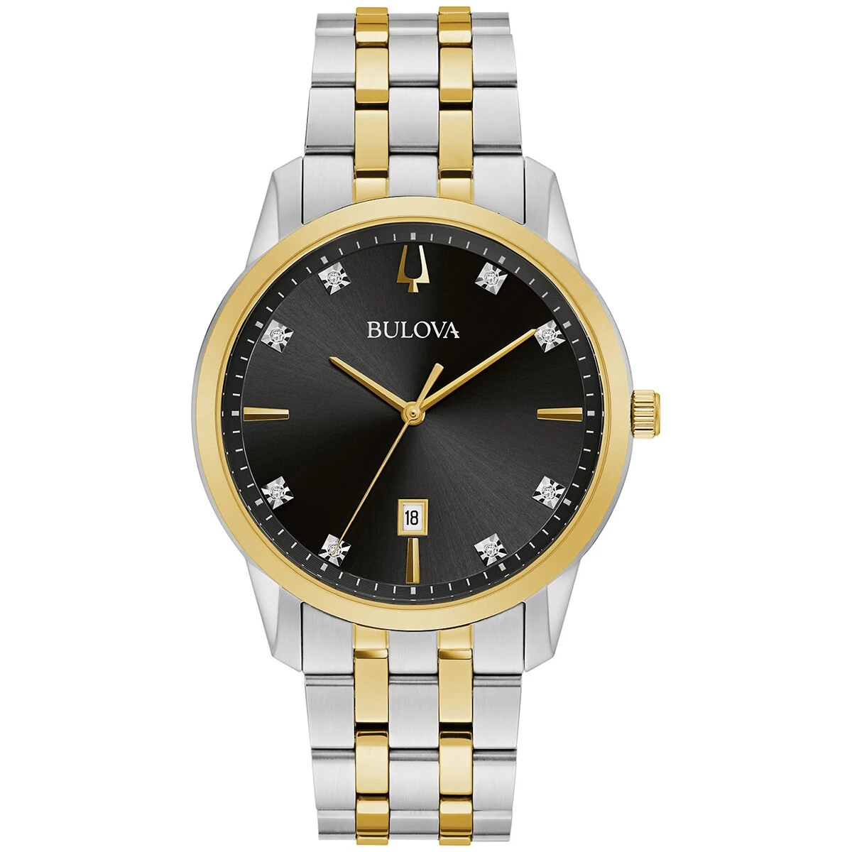 This Mens Bulova Two-Tone Diamond Accent Bracelet Watch has a black dial featuring eight diamonds set on the dial, gold-tone hands, and a calendar window at the six oโclock position.