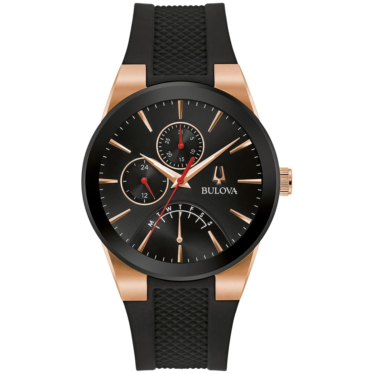 The Mens Bulova Two-Tone Multifunction Silicone Strap Watch features a rose gold-tone stainless steel screw-back case with black metalized crystal and a rose gold-tone crown. This watch features a black six-hand multi-function dial that displays the day and date, 24-hour features, and rose gold-tone accents with a red second hand.
