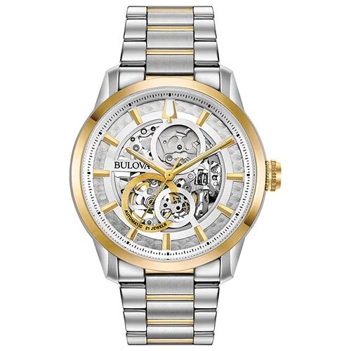 This Mens Bulova two-tone skeleton dial bracelet watch showcases a sophisticated design with a full exhibition dial and case-back. It features a skeletonized silver white three-hand dial that reveals the intricate workings of a self-winding 21- jewel movement. It is finished with domed mineral crystal, a stainless steel and gold-tone bracelet with push-button deployant clasp. This piece is water resistant to 30 meters. Case Dimensions: 43mm.Style 98A214.Limited Manufacturer’s Warranty.