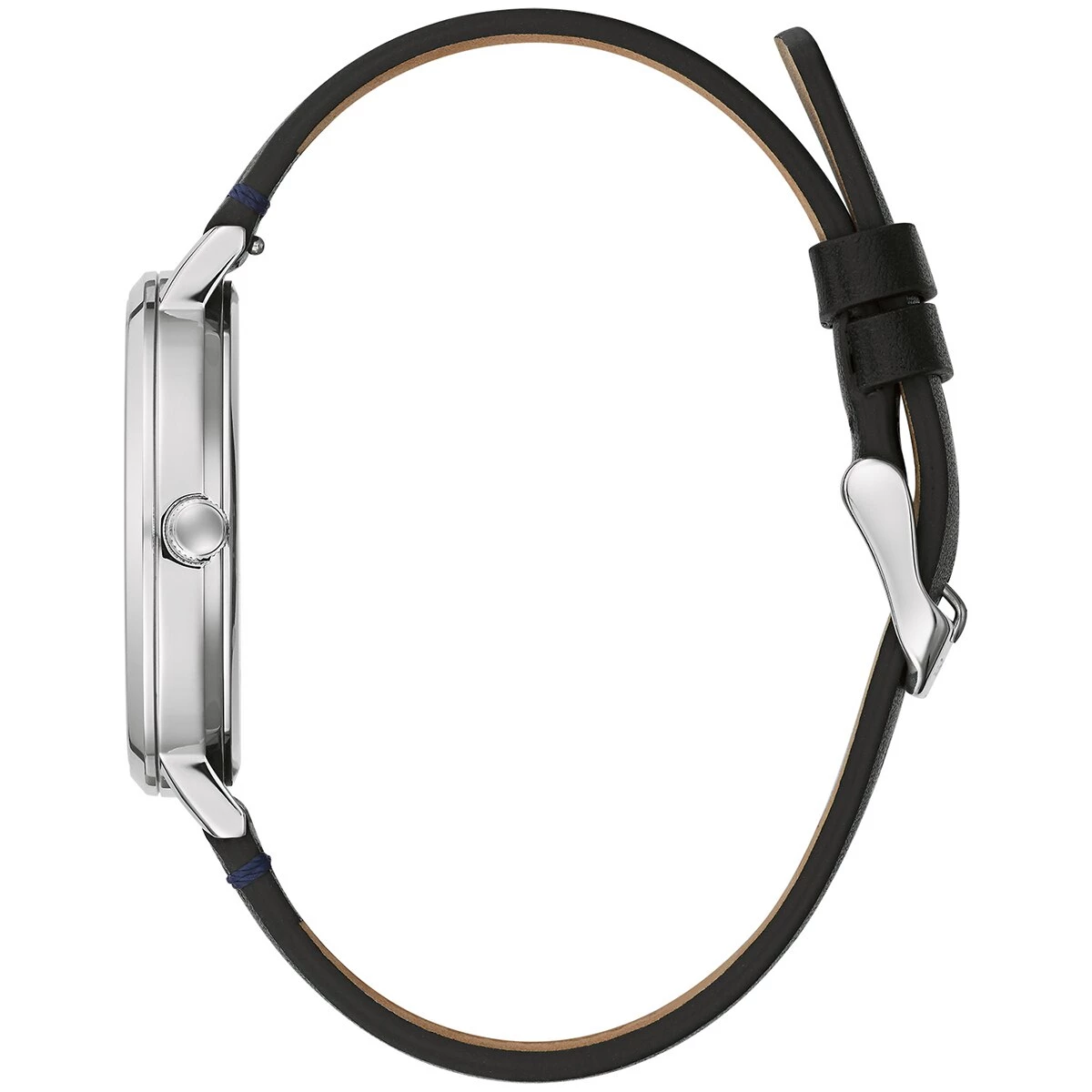 The Mens Caravelle by Bulova black leather watch features a stainless steel case with a blue dial featuring movement with a 24-hour sub-dial at the six o’clock position. This watch offers a mineral crystal lens and black leather strap finished with a square edge for a more casual feel. This watch is water-resistant up to 30 meters.
