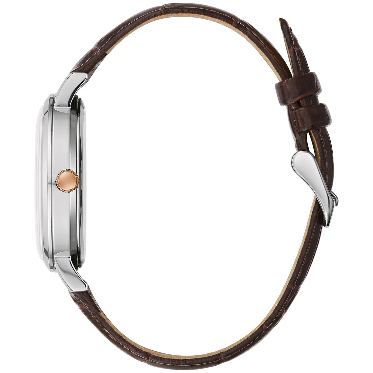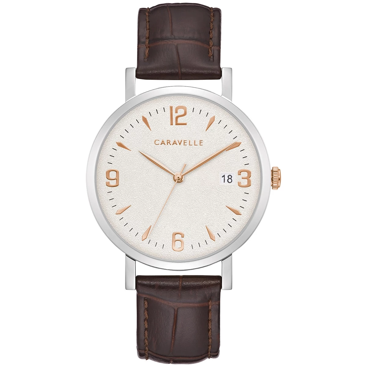 The Mens Caravelle by Bulova brown leather watch is a retro style with a modern edge. This watch offers a silver-white dial and a touch of rose gold-tone for extra flair, brown leather strap with crocodile pattern, and a domed mineral crystal lens. This watch is water-resistant up to 50 meters.