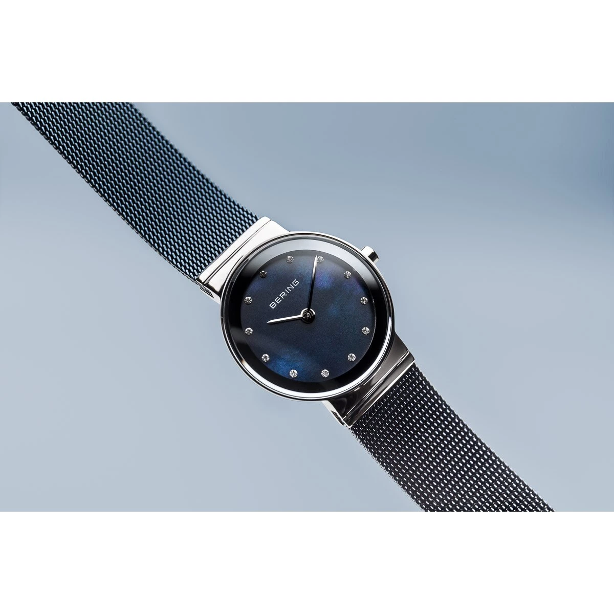 Be classic, puristic, and yet exciting in this BERING Crystal Accent Watch. Perfect style combined with contemporary minimalism. Inspired by Danish design, the CLASSIC COLLECTION represents a unique timepiece, perfectly highlighting your daily style.The polished silver-colored stainless steel case, made of pure, high quality, medical-grade stainless steel (316L), in combination with the modern blue colored Milanese strap, provides the classic BERING look. The fine workmanship of the Milanese strap gives the watch a refined, almost noble touch. A mother of pearl dial embellished with SWAROVSKI ELEMENTS and protected by crystal clear, scratch-resistant sapphire crystal perfectly completes the classic look.