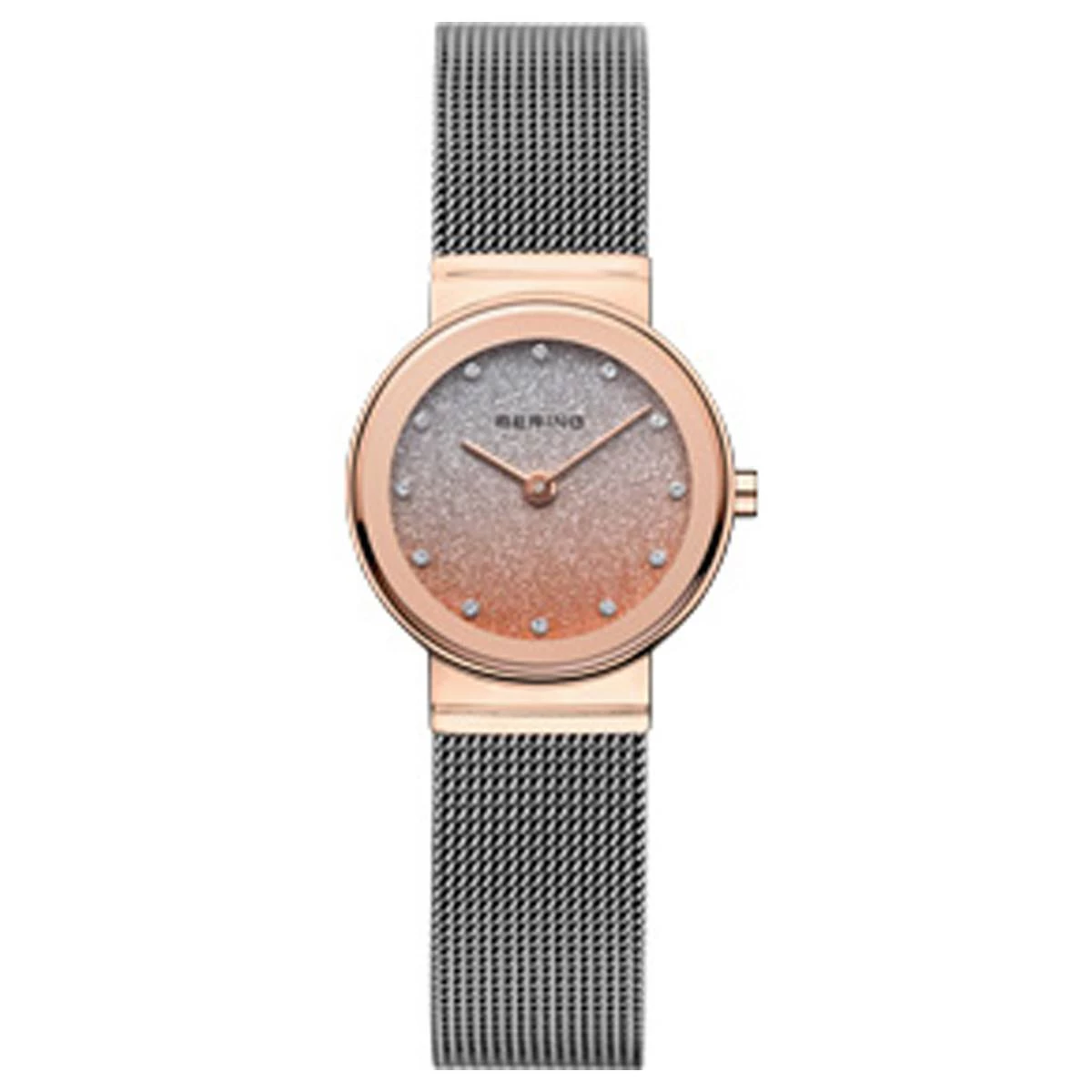Tell time in style with this BERING grey mesh bracelet watch with rose case, rose and grey pave crystal dial, grey bracelet, and sapphire crystal. Classic, pure, yet exciting. Perfect style combined with contemporary minimalism. Inspired by Danish design, the CLASSIC COLLECTION represents a unique timepiece, perfectly highlights your daily style. The cool look of the stainless steel and the puristic and clear line of the BERING watch design complement each other ideally and guarantee a sparkling appearance.