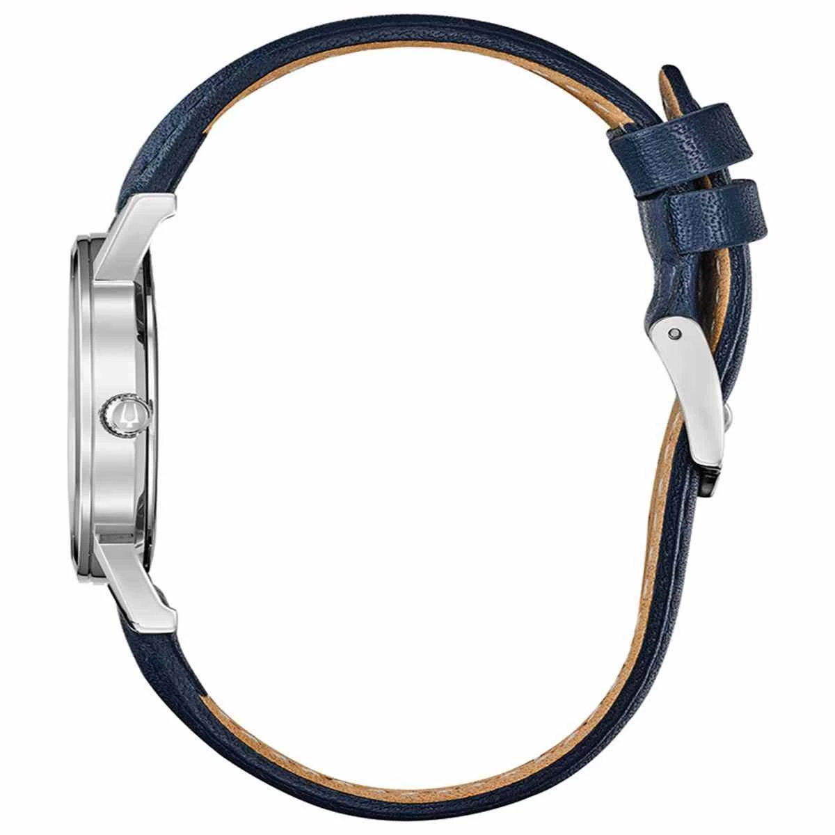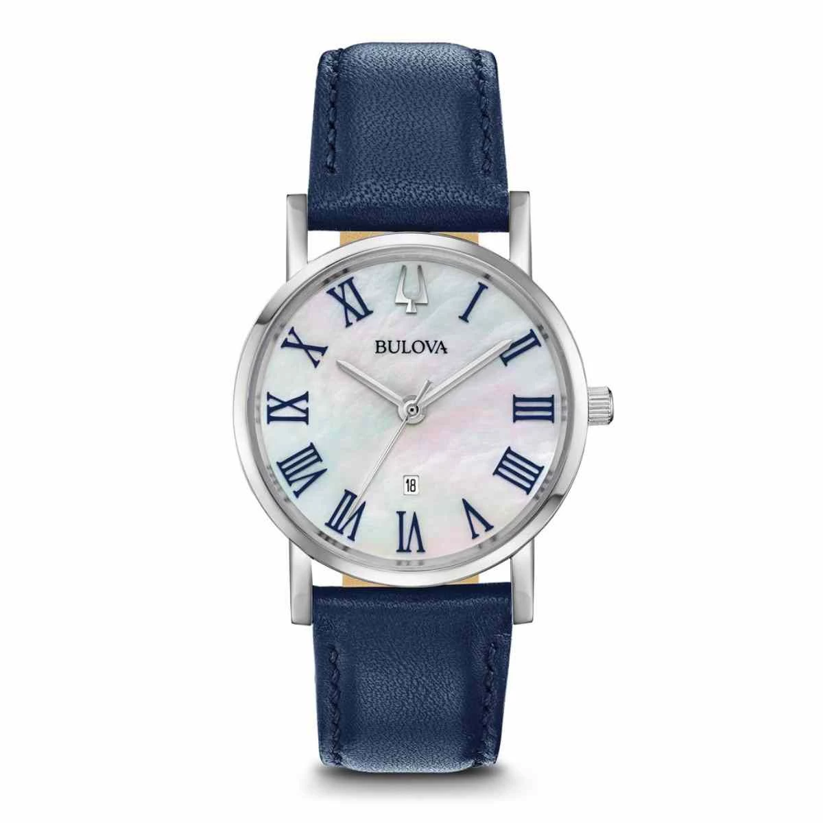 This Womens Bulova American clipper watch showcases a slim profile in stainless steel. Its design features a white mother of pearl dial with chic Roman markers, a date feature, flat mineral glass, and a smooth grain dark blue leather strap. It is finished with a three piece buckle closure and is water resistant to 30 meters.
