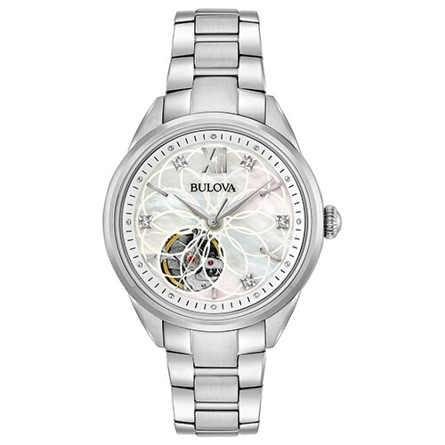 The Womens Bulova automatic movement watch showcases 5 diamonds that are individually hand set on a white mother-of-pearl dial. It features an open aperture, an exhibition case back, an automatic heart-beat movement with 40-hour power reserve, and domed sapphire crystal. Other features include: a stainless steel bracelet with double-press deployment closure, and is water resistant up to 30 meters. Diameter: 34.5mm Thickness: 10.85mm.Style 96P181.Limited Manufacturer’s Warranty.