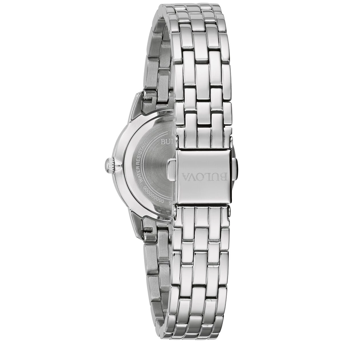 This Womens Bulova crystal accent watch and necklace gift set coordinate for easy styling. The watch has a stainless steel case and bracelet featuring 58 brilliant Crystals around the case and on the lustrous white mother-of-pearl dial. Also includes flat mineral crystal, three-hand quartz movement, and water resistance to 30 meters. The elegant heart-shaped necklace also features 28 crystals on an 18” stainless steel chain. Presented in an elegant gift box.Limited Manufacturer’s Warranty.