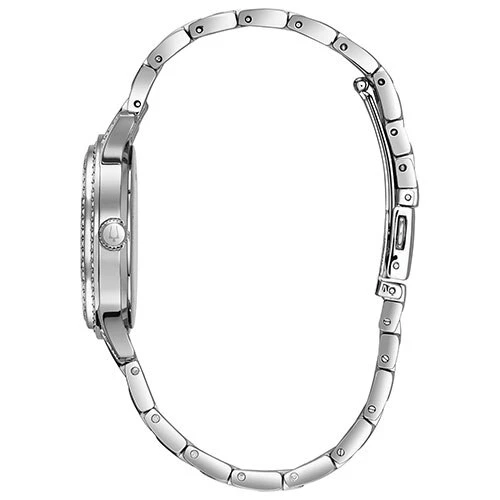 The Womens Bulova crystals collection watch is embellished with 292 crystals on the bracelet, bezel, and black dial. It showcases mineral glass, six hand multi-function movement, and a stainless steel bracelet with fold over closure. Water resistant up to 30 meters. Watch case dimension: 33mm.Style 96N110.Limited Manufacturer’s Warranty.
