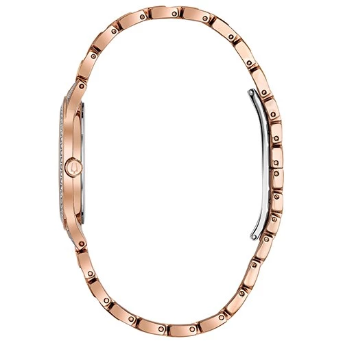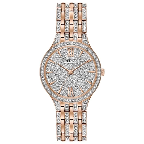 The Bulova Crystals slim pave dial watch features a new slim dress styling in rose gold-tone stainless steel and embellished with 440 crystals on the bracelet, bezel, and pave dial. Other features include: a deployment closure and water resistance up to 30 meters.Style 96L243.Limited Manufacturer’s Warranty.