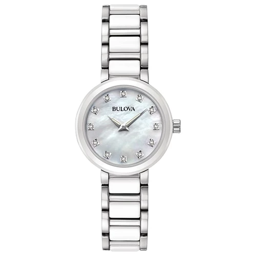 The Bulova Diamond Collection watch showcases a new white ceramic and stainless steel case with 12 diamonds individually hand-set on a white Mother of Pearl dial. It features domed mineral glass, a white ceramic and stainless steel bracelet, with a simple deployment closure, and is water resistance up to 30 meters. Dimensions: 28mm.Style 98P158.Limited Manufacturer’s Warranty.