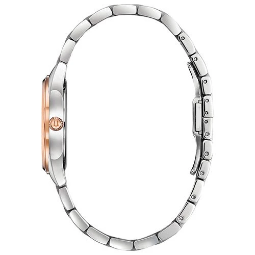 This Womens Bulova diamond accented two-tone bracelet watch is a slim design. It features a stainless steel and rose gold tone case with a lustrous white mother of pearl three hand dial and 8 diamonds. The design is finished with domed sapphire crystal, a stainless steel and rose gold tone bracelet and a push button deployant clasp. This watch is from the Quartz movement and is water resist to 30 meters. Dimensions: 32.5mm.Style 98P183.Limited Manufacturer’s Warranty.