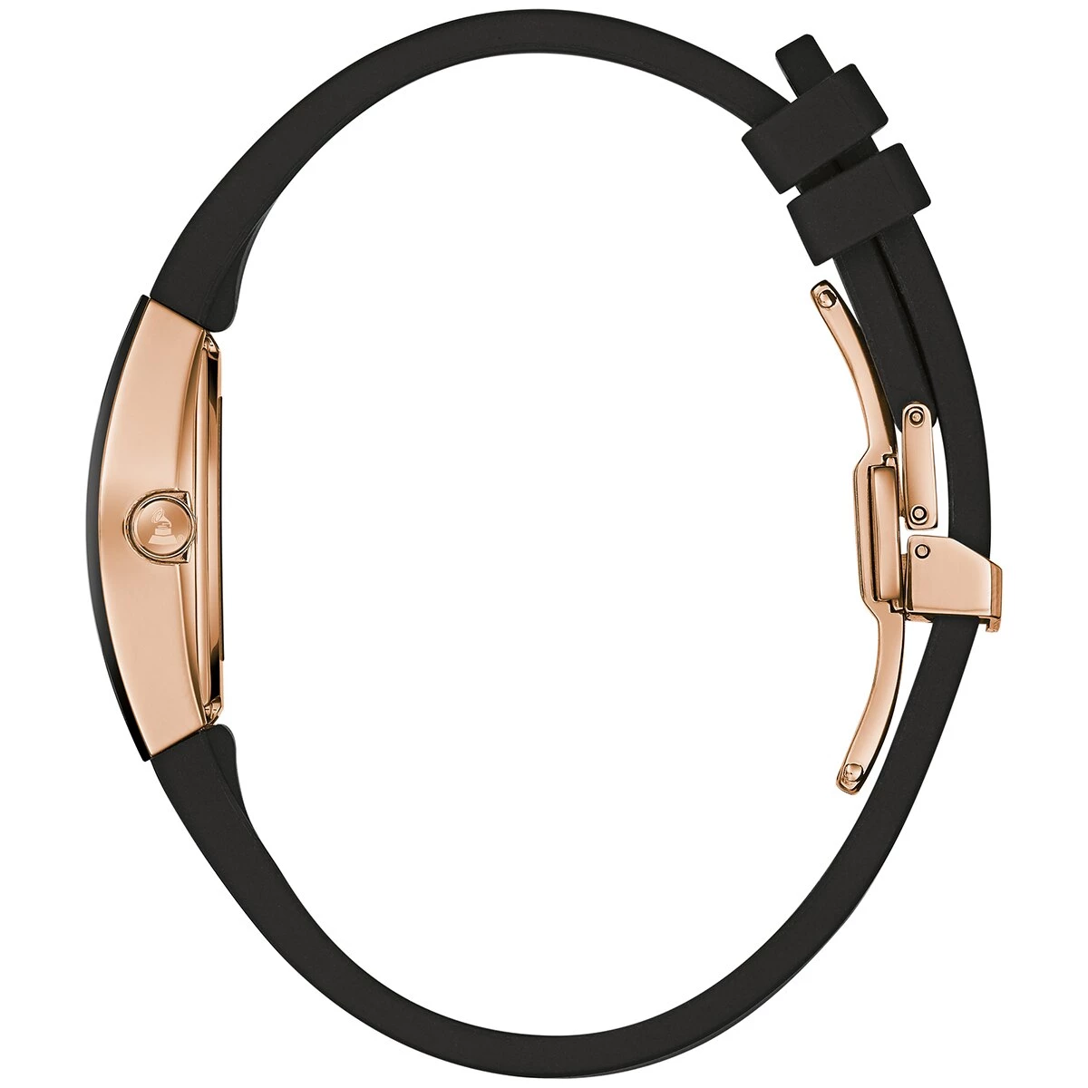 As the official Timepiece partner of The Latin GRAMMYs®, this Womens Bulova Latin GRAMMY® Gemini watch has a new curved tonneau design. The distinctive asymmetrical rose gold-tone stainless steel case with black signature Futuro edge to edge curved metalized crystal features a black dial with rose gold-tone accents. The black silicone strap features the iconic Latin GRAMMY® logo on the front, as well as on the case back which showcases the platinum colored logo to commemorate the 21st Annual Latin GRAMMY® Awards. The watch features three-hand quartz movement, deployant buckle with pushers, and water resistance to 30 meters.Limited Manufacturer’s Warranty.