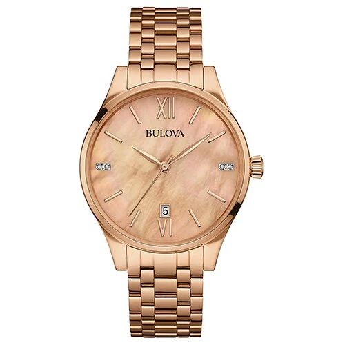 Womens Bulova Maiden collectionstainless steel watch features a rose gold-tone finish and 4 diamonds individually hand-set on a rose gold-tone Mother of Pearl dial, flat mineral glass, three-hand calendar, and a double-press deployment closure. Case size: 36mm. Limited Manufacturer’s Warranty.Style 97P113.