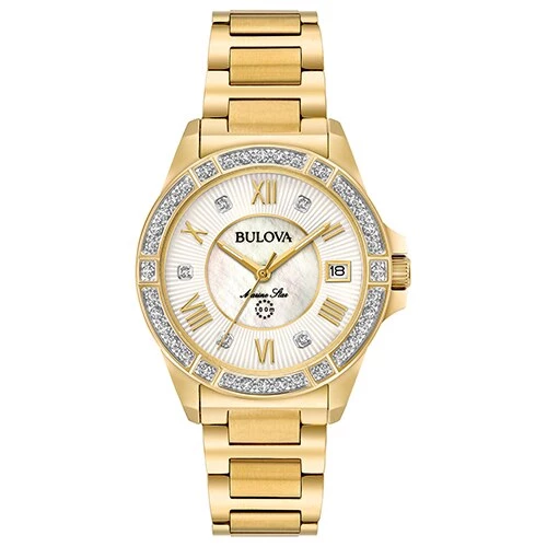 The Womens Bulova Marine Star bracelet watch showcases 29 diamonds that are individually hand set on a gold tone accented bezel and dial. It features a white Mother of Pearl inner dial, sapphire glass, a screw back case, a stainless steel bracelet, a double press deployment closure and is water resistant up to 100 meters.Style 98R235.Limited Manufacturer’s Warranty.