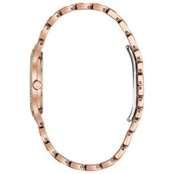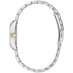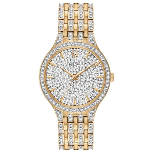This Womens Bulova phantom crystal pave bracelet watch is an absolutely stunning piece in a new slim and sleek style. It is embellished with 440 crystals and features a gold and silver-tone stainless steel case and bracelet with a clear pave dial. Other features include a flat mineral crystal and a quartz movement. Water resistance to 30 meters. Case Size: 32mm.Limited Manufacturer’s Warranty.