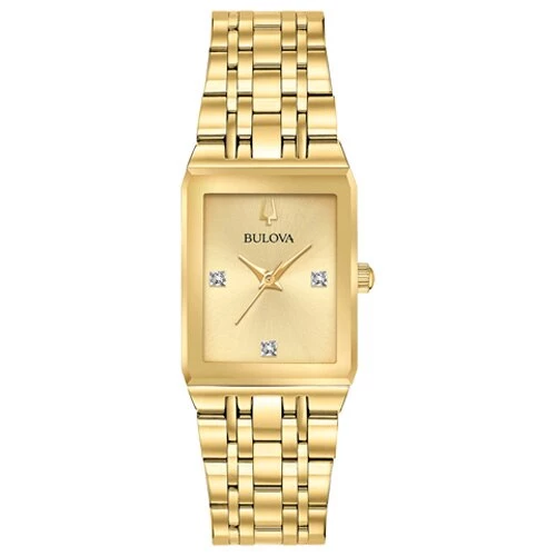 This Womens Bulova Quadra gold-tone bracelet watch is a new tank style. It features a silver-tone stainless steel case with edge to edge blue faceted metalizing mineral crystal, and a gold-tone crown. The champagne dial includes three sparkling diamonds set on the 3, 6, and 9 o’clock hours. Water resistance to 30 meters. 20.5mm x 32mm.