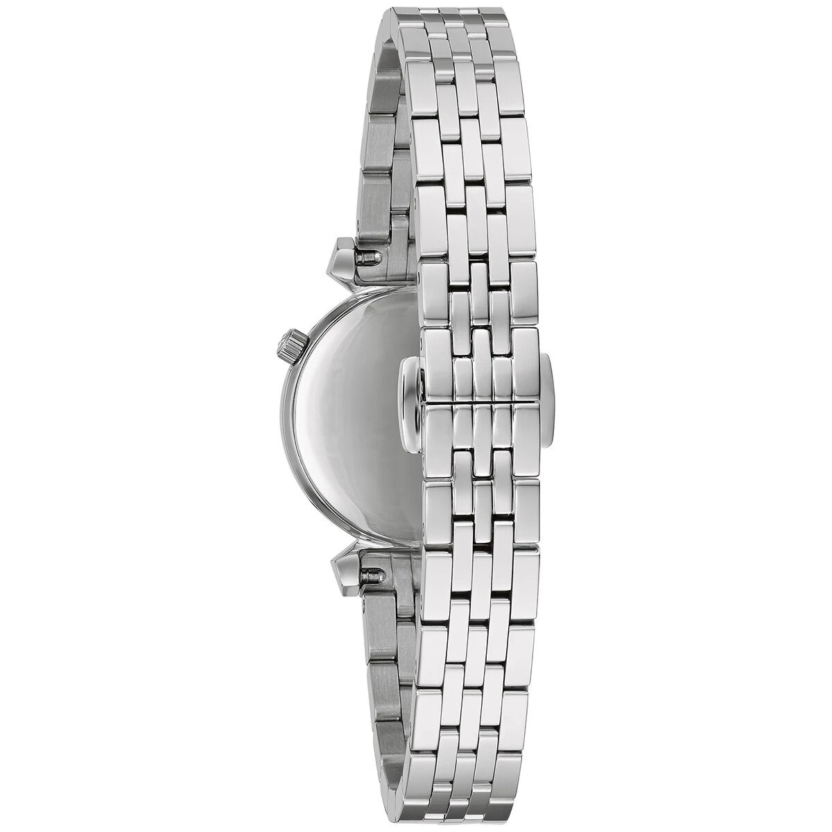 Inspired by Bulova heritage timepieces, this Womens Bulova Regatta diamond accent bracelet watch features a lustrous black mother-of-pearl dial set with 11 diamonds and petite stainless steel. Signature Regatta design details feature the crown at the 2 oโclock position and distinctly angled lugs. This watch also includes flat sapphire crystal, slim quartz movement, and is water resistance to 30 meters.Limited Manufacturer’s Warranty.