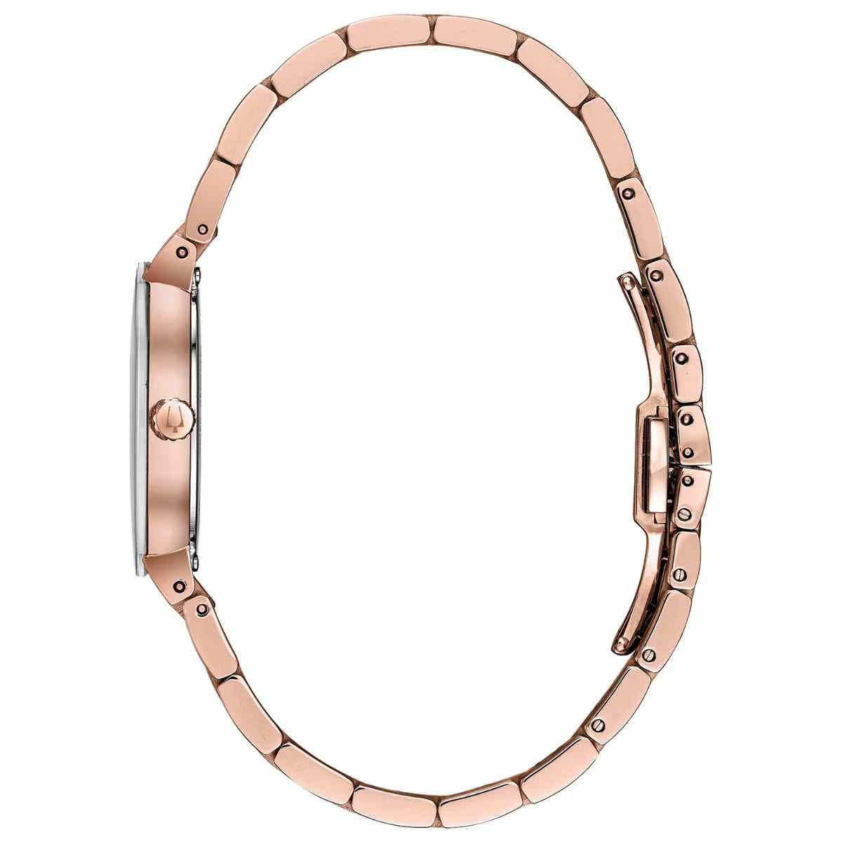 This Bulova rose gold and diamond accented watch is from the Modern Collection. Its design is in rose-gold-tone stainless steel with 11 diamonds that are individually hand set on the rose-gold mother of pearl dial. Other features include a metalized edge to edge domed mineral crystal, and a rose-gold-tone stainless bracelet. It is finished with a double-press deployant closure, and is water resistant to 30 meters.