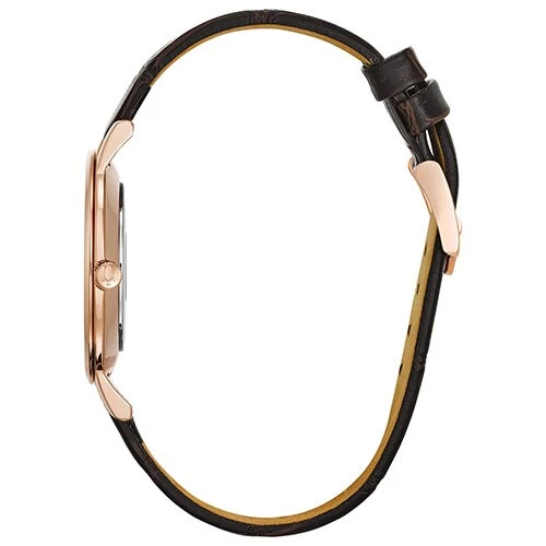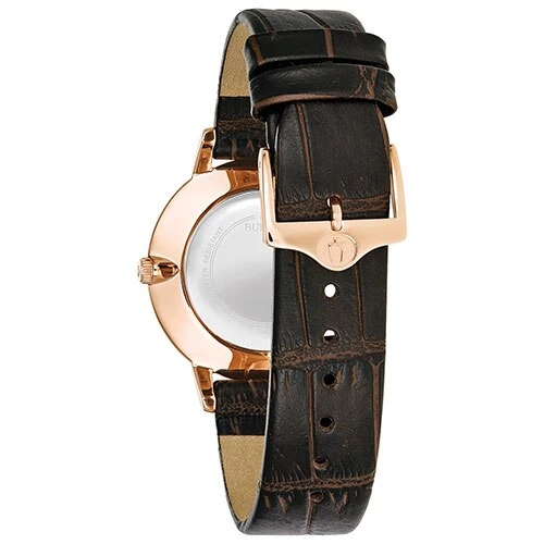This Bulova rose gold-tone and diamond dial watch features a new ultra-slim and classic style. Its design showcases three diamonds individually hand set on the light champagne dial with mineral glass, and a chic croco-embossed brown leather strap. Water resistant to 30 meters. To clean wipe with a soft dry cloth. Case Dimensions: 36mm x 6mm.Style 97P122.Limited Manufacturer’s Warranty.