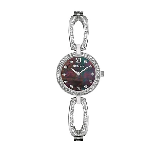 This Womens Bulova Crystal Collection stainless steel watch showcases 129 individually set crystals on the silver-tone case. It features a black Mother of Pearl dial, flat mineral glass, a jewelry clasp closure, and is water resistance to 30 meters. Watch case size: 26mm.Style 96L224.Limited Manufacturer’s Warranty.
