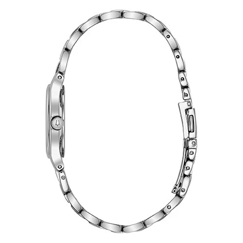 This Womens Bulova stainless steel and blue accent dial bracelet watch is a slim style with a stainless steel case, a silver-white dial and with blue hands and markers. Water resistant to 30 meters. To clean wipe with a soft dry cloth. Case Dimensions: 28mm x 7mm.Style 96L215.Limited Manufacturer’s Warranty.