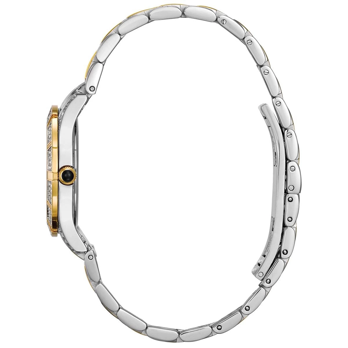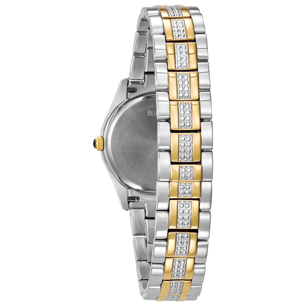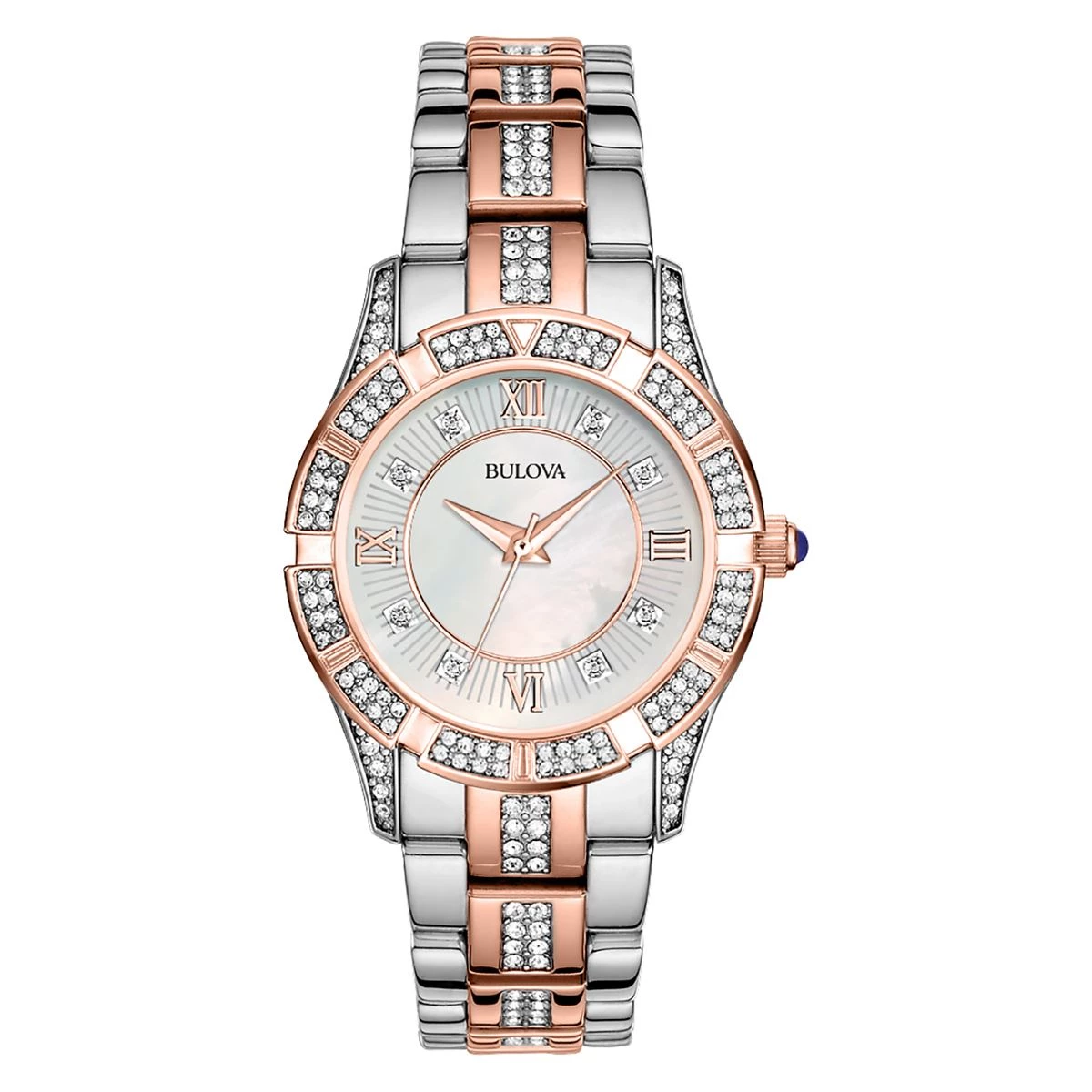 This Bulova two-tone crystal accented bracelet watch is from the Crystal Collection. Its design is in stainless steel with a two-tone rose gold and silver finish. It features over 200 individually hand set crystals on the case, bracelet, and white mother of pearl dial. Other features include a second hand with a black cabochon crown, a deployant closure, and is water resistant to 30 meters.